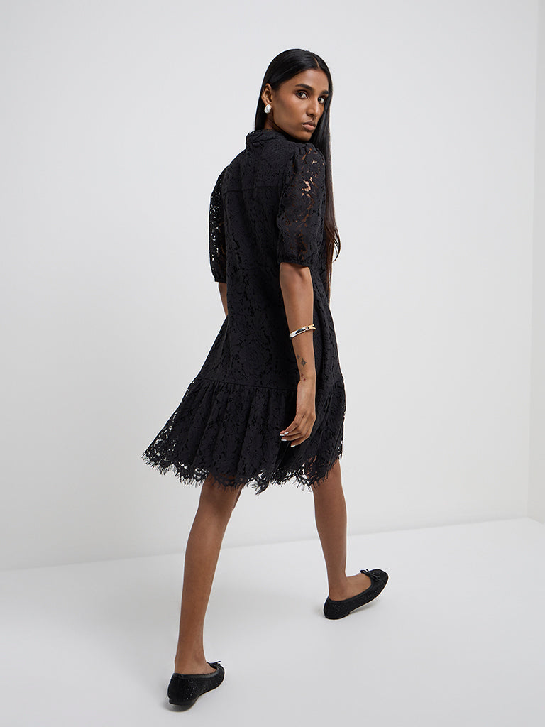 This black dress from Wardrobe showcases a lace finish. Crafted from a lightweight fabric, the drop-waist creation includes a notched neckline that extends a button placket and puff sleeves.