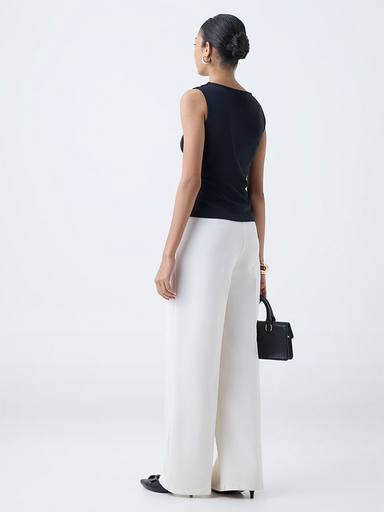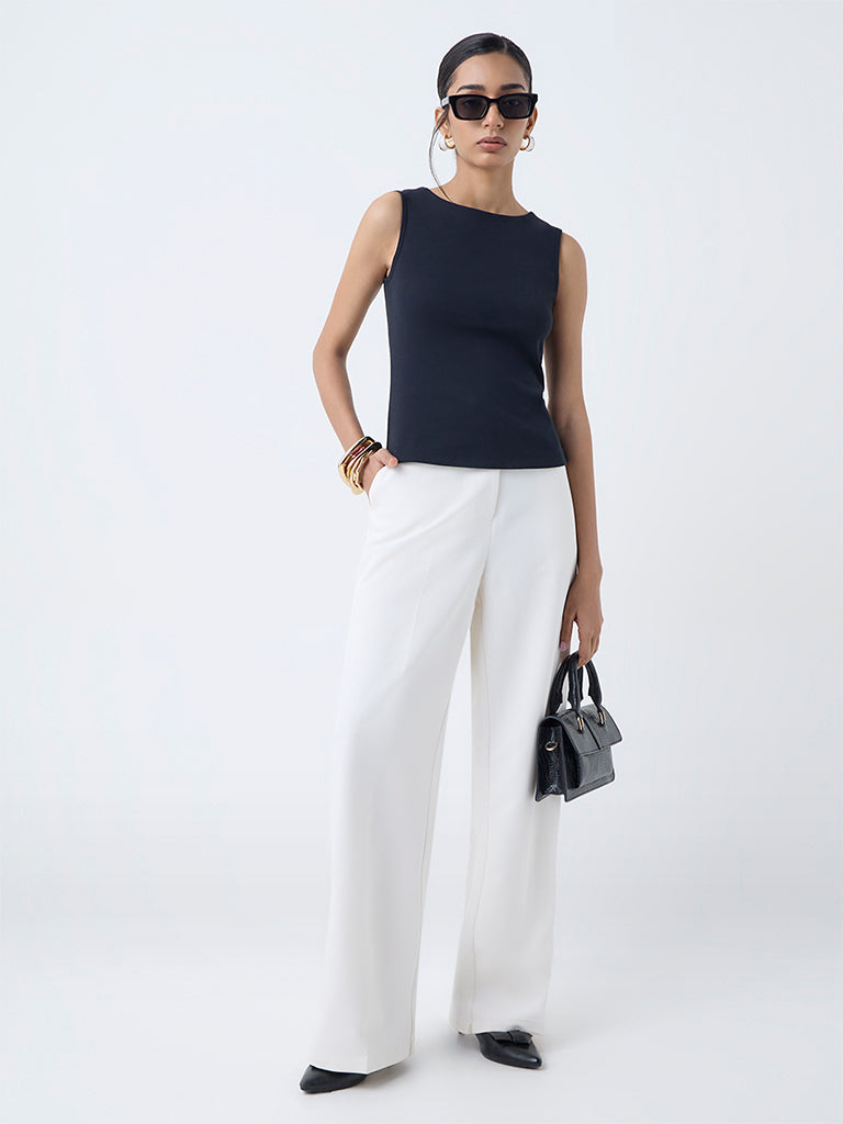 This black t-shirt by Wardrobe offers a sleek foundation for weekday styling. Crafted in a cotton blend for all-day breathability, the sleeveless cut and round neck frame a minimal silhouette made for layering under blazers.