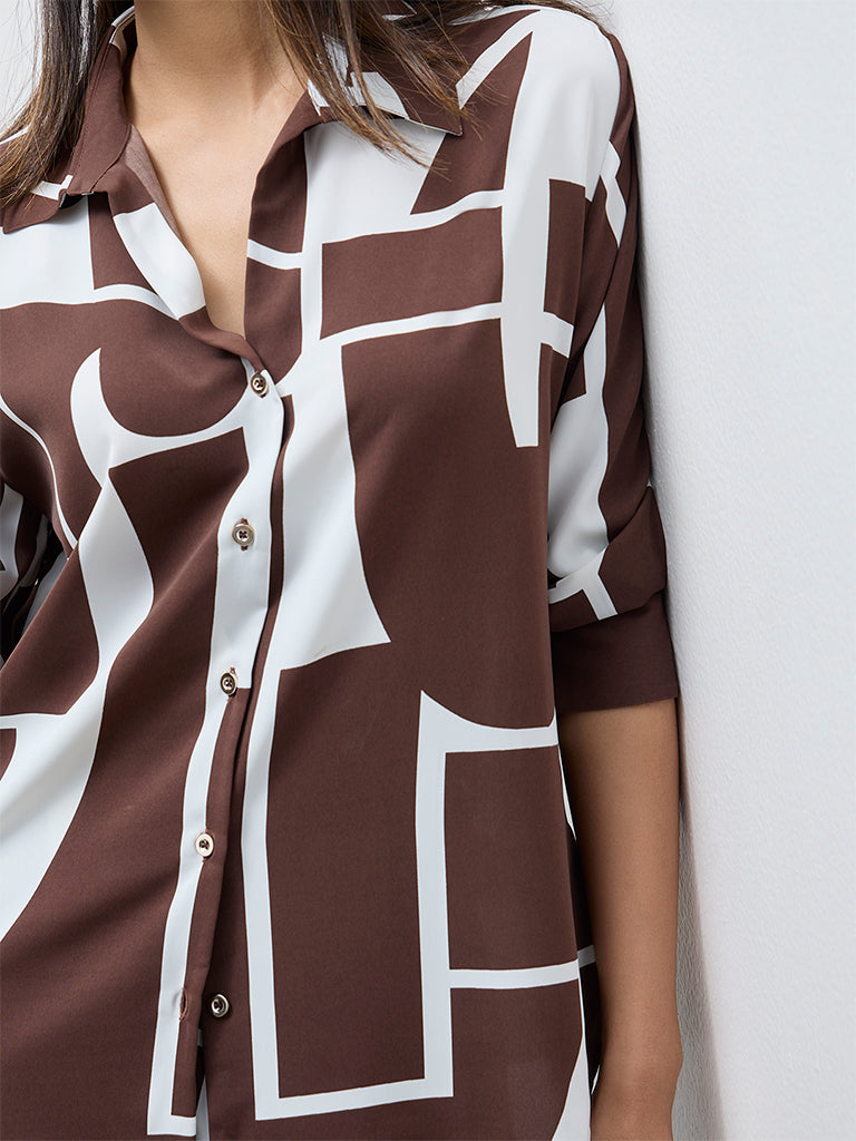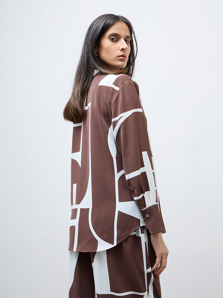 Bringing a modern update to workwear staples, this brown shirt from Wardrobe features an abstract print that adds visual definition. Crafted from a smooth, lightweight fabric, it is designed with a shirt collar, button-up front and full sleeves that can be worn rolled or down.