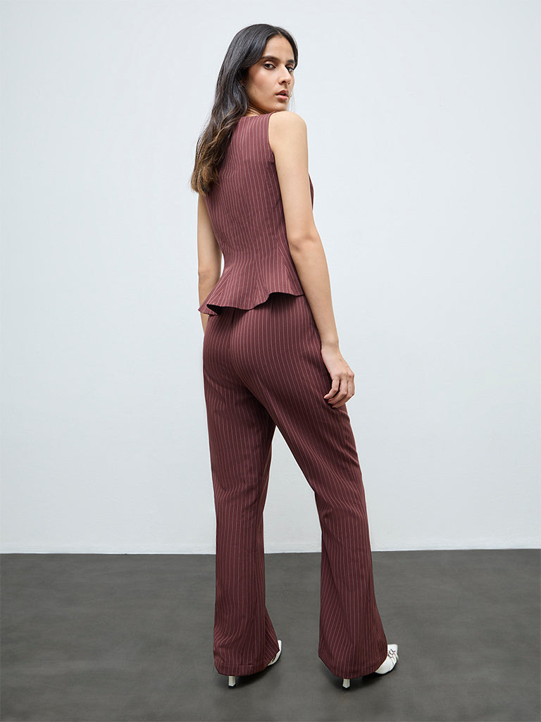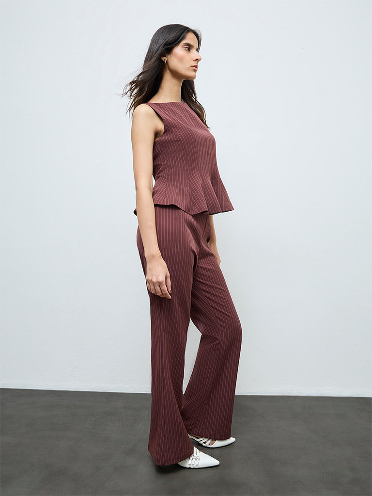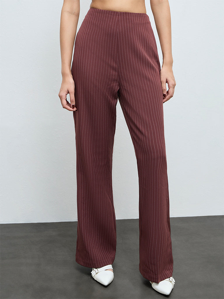 Wardrobe presents these brown trousers, defined by pinstripe patterns that lend a tailored, formal appeal. Cut in a high rise silhouette, they feature a discreet side zipper for a clean finish. Crafted from a breathable fabric, they ensure a soft, comfortable feel through the day. Easy to style with coordinated tops or wear on their own, they make a refined choice for smart casual dressing.