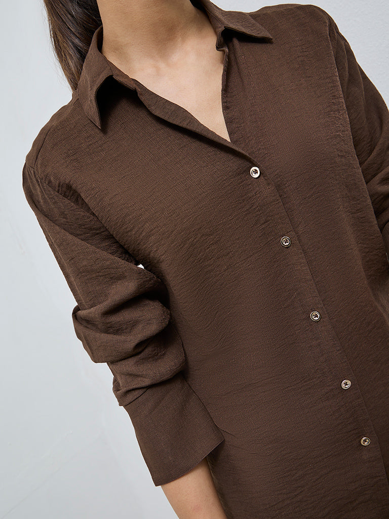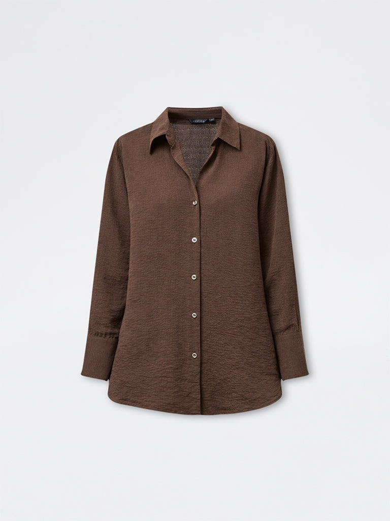 This dark brown shirt from Wardrobe serves as a smart choice for polished everyday dressing. It features a V neck, a button up front and full sleeves that create a neat, structured look. Made from a soft, breathable fabric, it offers lasting comfort while holding a crisp shape through the day.