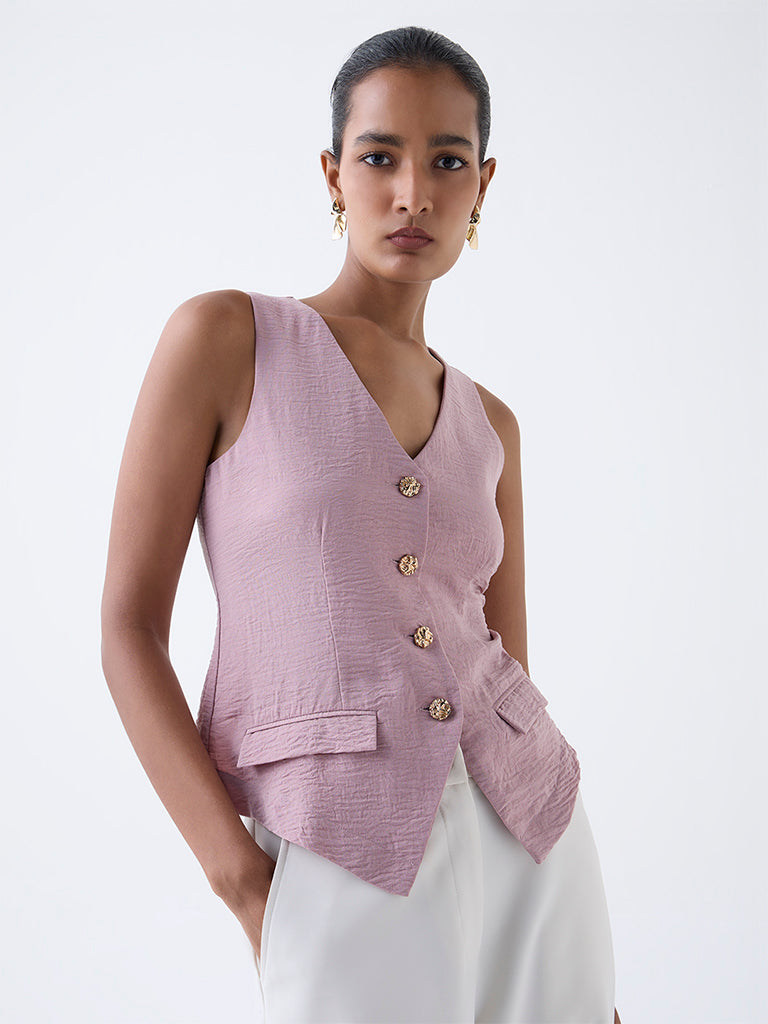 A look made to lift your everyday, Wardrobe presents this dusty pink waistcoat shaped with a V-neck, a sleeveless cut and a gold-toned button placket that gives the front its distinctive charm. It is milled from a smooth, breathable fabric with a crinkle texture adding depth to the surface. Completed with imitation flap pockets for a structured appeal, this is a smart layer for days when you want a sharper finish.