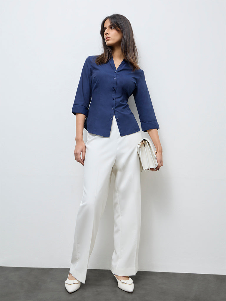 Bringing a sharp finish to everyday workwear, this indigo shirt from Wardrobe is tailored for polished ease. Crafted from a smooth, fluid fabric, it features a V-neck with a button-up front and three-quarter sleeves for a refined silhouette.