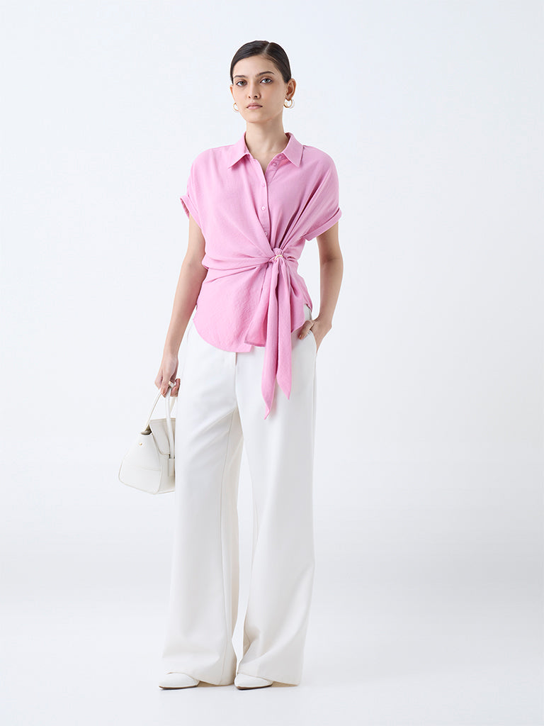Wardrobe gives a contemporary twist to workwear with this pink blouse, styled with a chic knot detail on the front. Milled from a breathable fabric for a soft, airy feel, it is framed with a smart collar that extends to a button placket and upturned dolman sleeves.