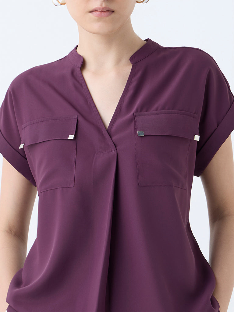 Add a refined touch to your office edit with this plum top from Wardrobe. Styled with a mandarin neck and relaxed dolman sleeves, it features dual chest pockets for a structured finish. Made from a lightweight fabric, it’s a versatile piece that keeps you polished through long workdays and beyond.