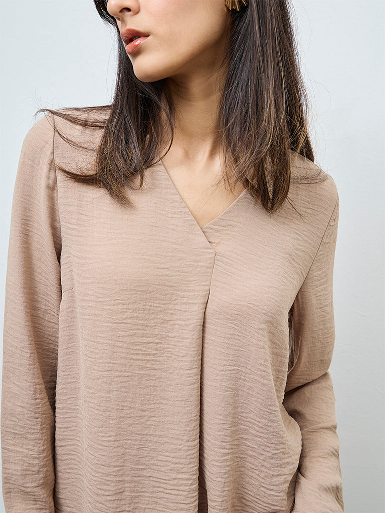 Wardrobe presents this versatile taupe blouse styled with a V-neck and full sleeves for a simple design. It is made from a soft, lightweight fabric with a crinkle texture that adds character to the minimal silhouette. Its understated design allows it to move easily from desk settings to casual outings.