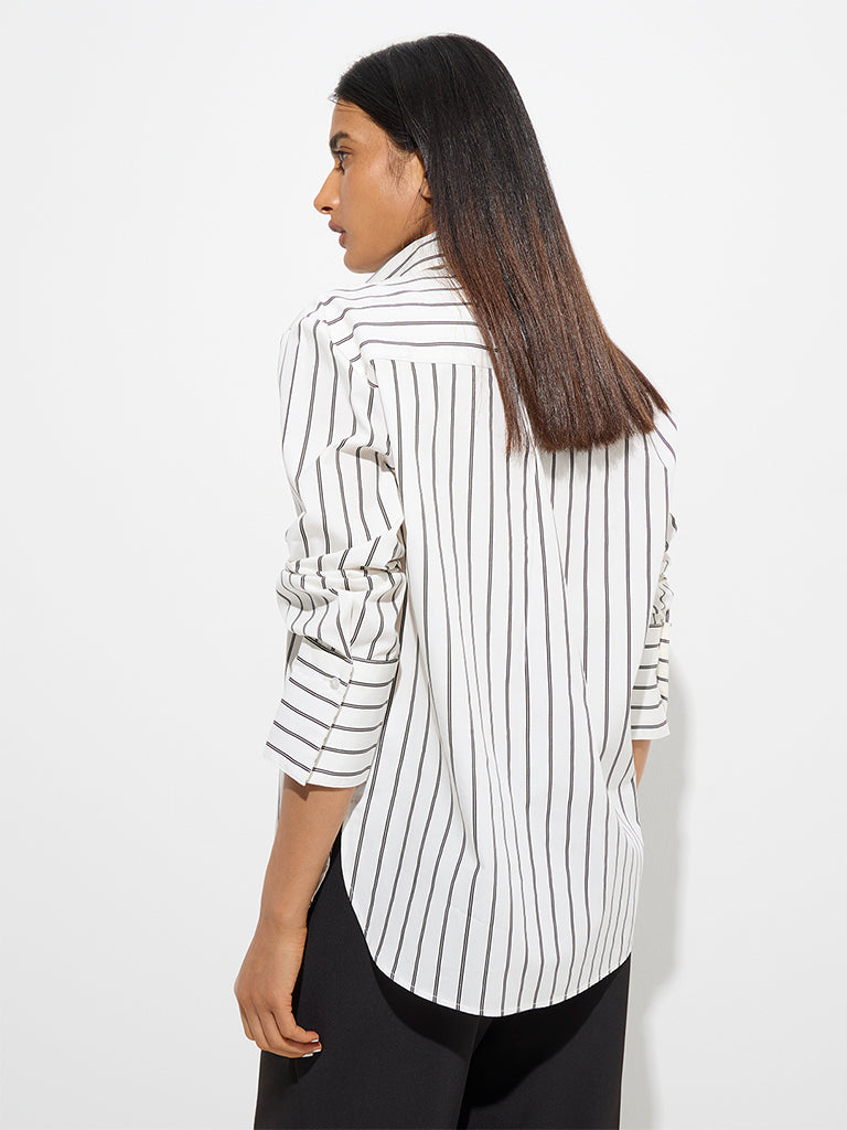This white shirt from Wardrobe makes a refined statement with its classic stripe pattern and clean structure. Woven from high-quality fabric, it features a sharp collar, concealed button placket, and full sleeves. Tailored for ease and elegance, it’s a go-to for modern formal dressing.