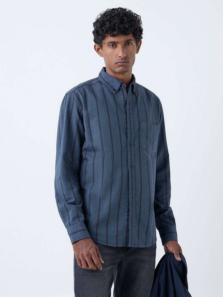 This charcoal striped WES Casuals shirt is cut in a relaxed fit for everyday ease. Crafted from quality fabric, it features a buttoned collar, button-down front, full sleeves, and a front pocket, a versatile choice for both work and casual wear.