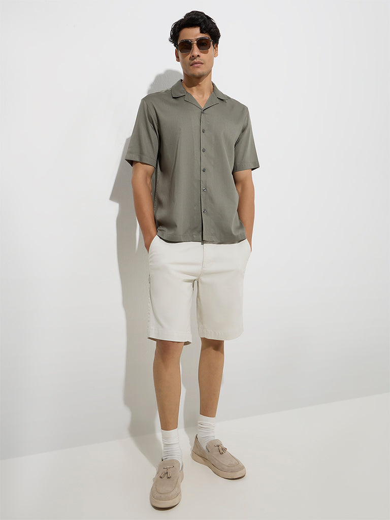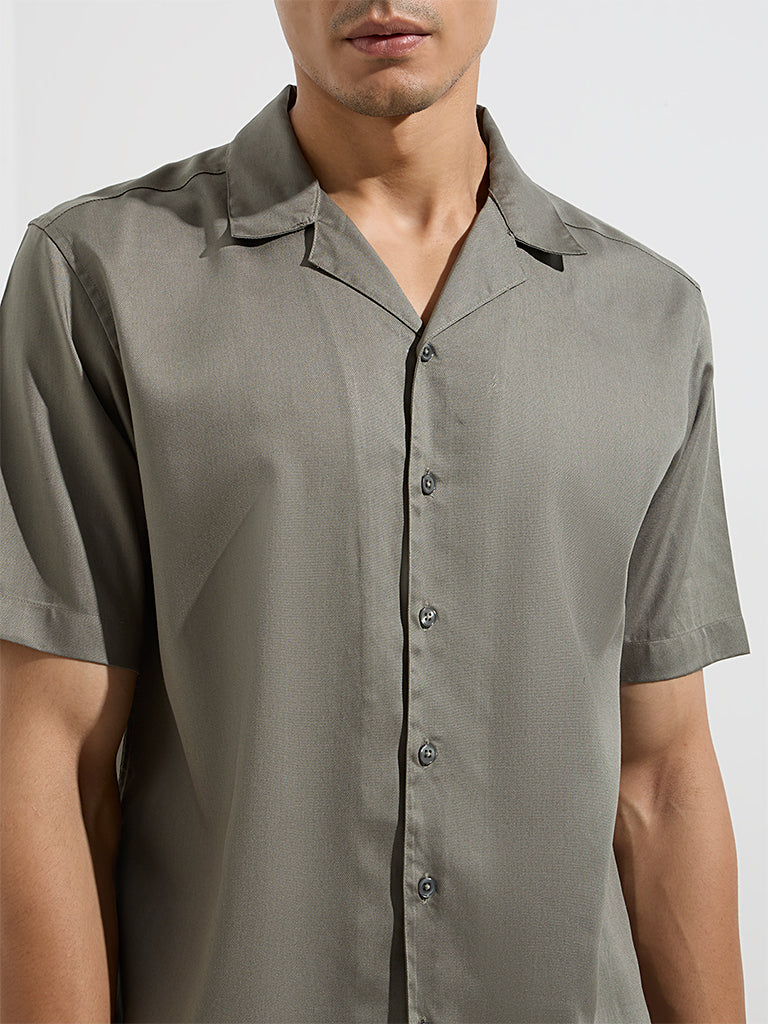 This dark sage shirt from WES Casuals is carved in a relaxed silhouette with a minimalistic profile. Made from high-quality fabric for lasting comfort, it's styled with a notched collar, half sleeves, and a button-up front for a laid-back yet put-together finish.