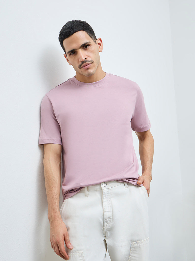 WES Casuals adds a soft tonal update to your casual rotation with this mauve T-shirt. Crafted from cotton-rich fabric, it offers an ultra soft feel against the skin for everyday use. The relaxed silhouette features a classic round neck and short sleeves, making it an easy choice for laid-back styling and off-duty moments.