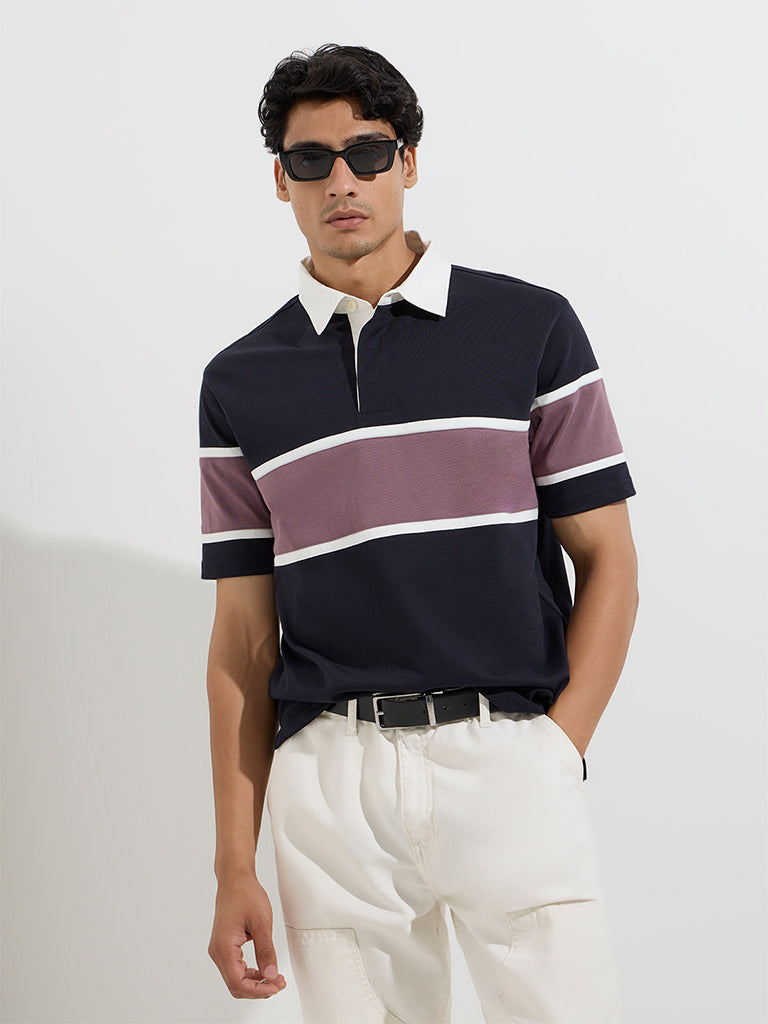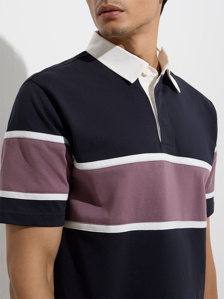 This navy polo t-shirt from WES Casuals brings a sporty edge to your casual looks with its colour-blocked design. Milled from a premium fabric for lasting comfort, it’s cut in a relaxed fit and detailed with a spread collar, brief button placket, and half sleeves.