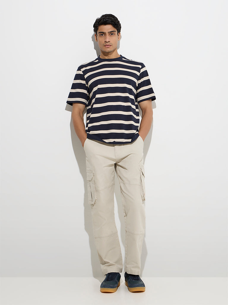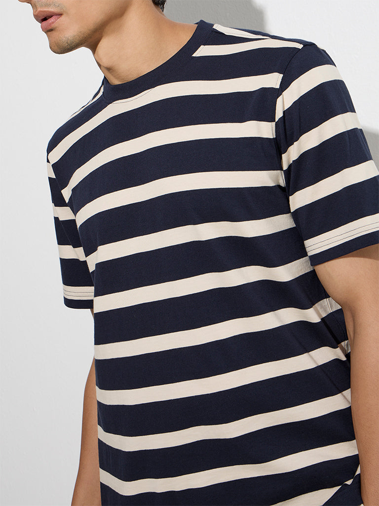 This navy t-shirt from WES Casuals is updated with crisp stripes for a modern edge. The relaxed silhouette, cut from pure cotton, offers breathable comfort through the day. Finished with a crew neck and half sleeves, it’s a reliable staple for low-effort, high-impact dressing.
