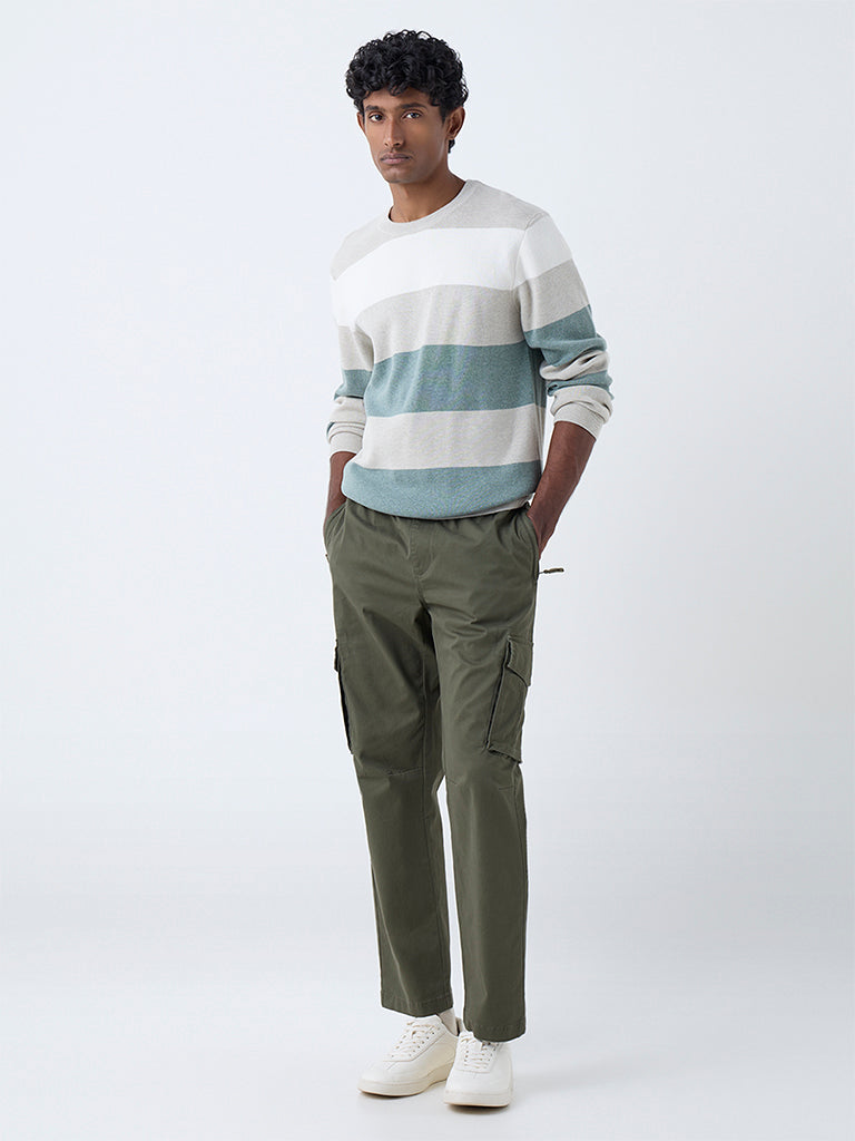 Designed for everyday ease, these olive cargo pants from WES Casuals are crafted in a breathable cotton-blend. The relaxed fit is anchored with an elastic waistband and drawstrings, while multiple pockets — including zippered compartments — add function to form. An easy choice for casual days, they balance practicality with effortless style.