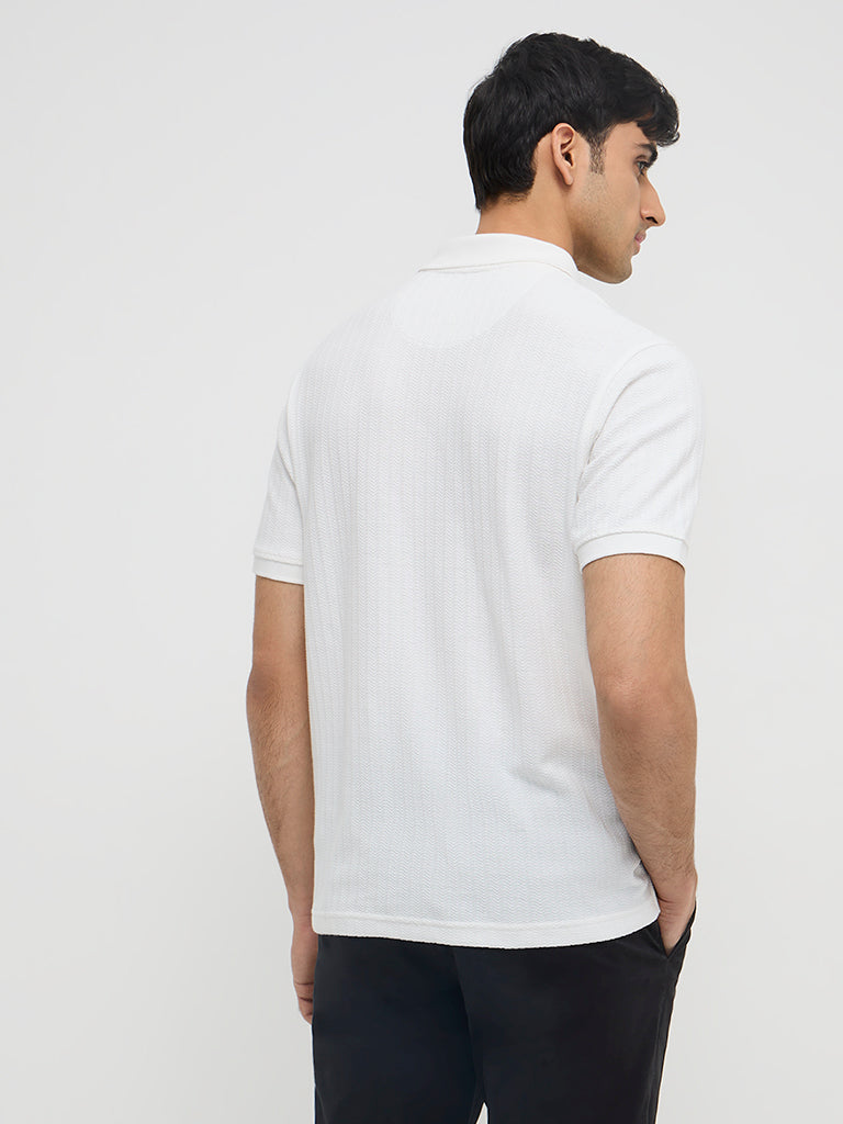 This white polo t-shirt from WES Casuals presents chevron designs. Its breathable composition coupled with the relaxed silhouette ensures utmost comfort. The spread collar which extends to a short zipper placket and half sleeves complete it.