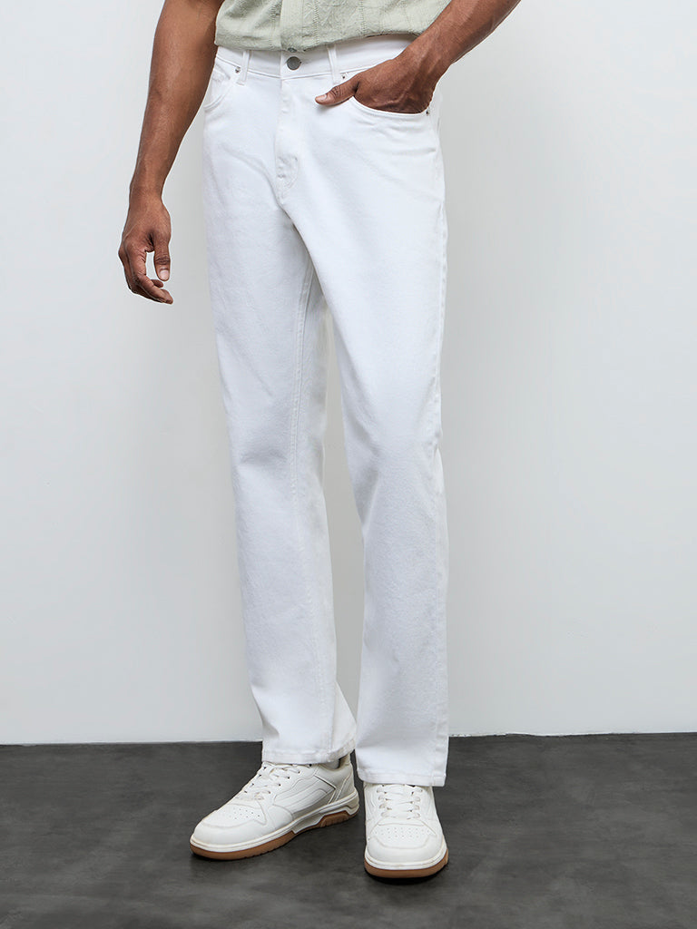 WES Casuals presents these white jeans shaped in a relaxed mid-rise fit for comfortable daily wear. Designed with regular side and back pockets, they balance utility with a neat silhouette. A zipper-fly and button closure ensure a secure fit, making them suitable for casual and smart-casual styling.