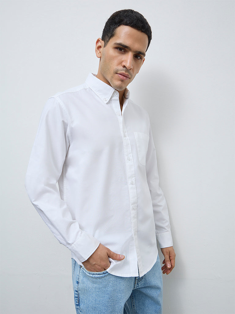 WES Casuals launches this white solid shirt crafted from pure cotton for all day comfort. Designed with a relaxed handle, it features a button down collar, full sleeves with buttoned cuffs and a single chest pocket for everyday practicality.