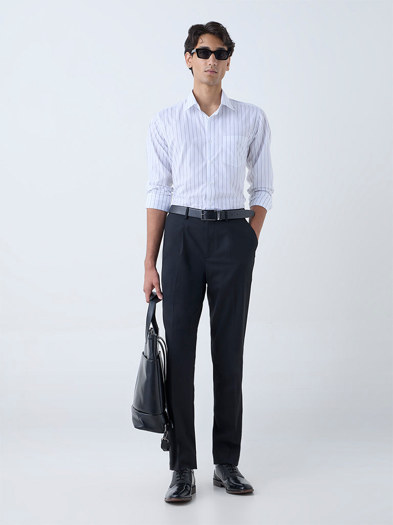 Carved in a relaxed silhouette, these black trousers from WES Formals offer a refined balance of comfort and structure. Tailored from a lightweight fabric, the mid-rise design features a structured waistband with button fastening, belt loops, a zip fly, and multiple functional pockets.