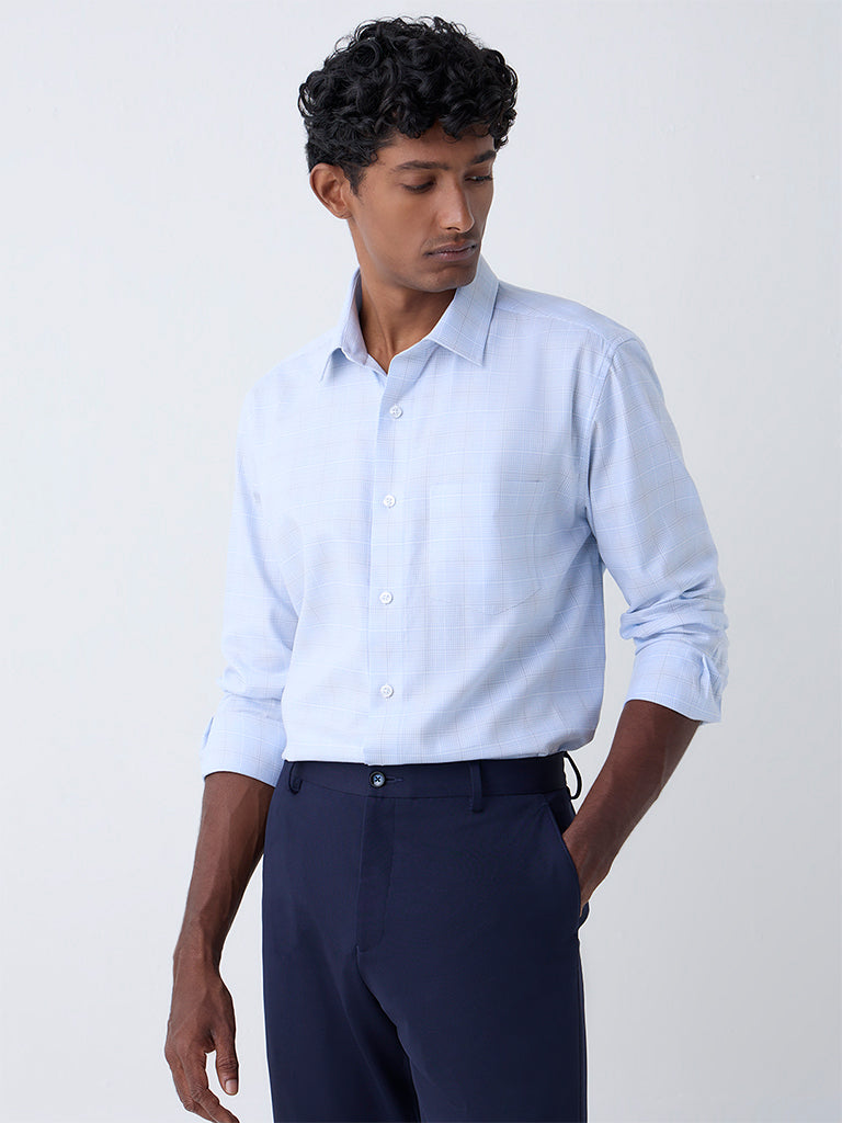 This blue shirt by WES Formals showcases checkered prints on a relaxed-fit silhouette. Crafted from pure cotton fabric, it features a spread collar, a button-up front and full sleeves. The chest pocket adds a functional accent to this work-wear essential.
