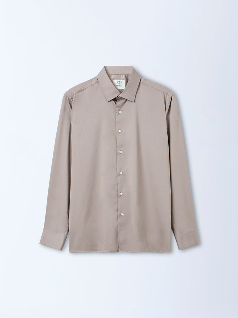 WES Formals presents this taupe-coloured shirt crafted from a premium bamboo-blend fabric for a soft, breathable feel. Designed with a refined contemporary aesthetic, it features a classic collar and full sleeves in a smart slim fit. Offering comfort with polish, it transitions seamlessly from formal settings to elevated everyday wear.