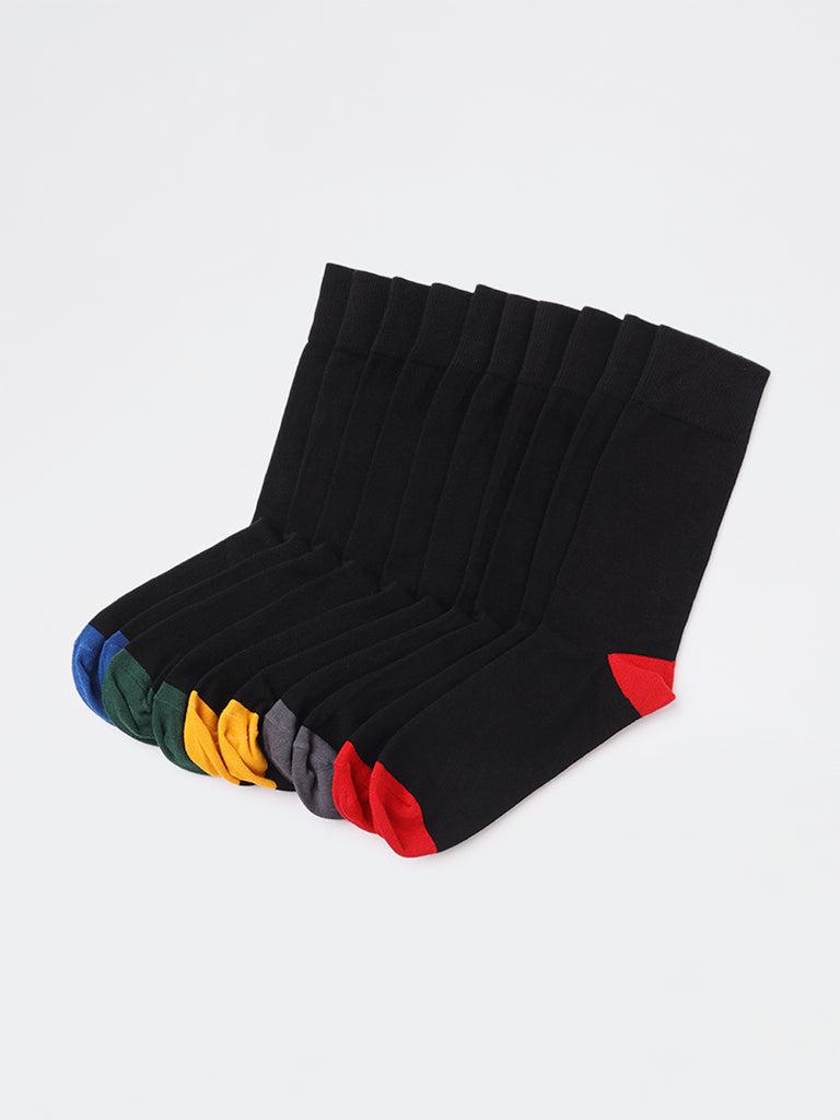 Clean, classic, and easy to wear, this pack of five black full-length socks by WES Lounge is finished with contrasting heels and toes. Crafted from soft, breathable fabric with gentle stretch, they provide lasting comfort and a secure fit. Reinforced stress zones improve durability for everyday use.
