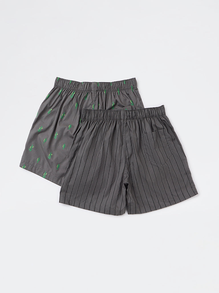Choose easygoing comfort with this twin-pack of boxers by WES Lounge. One showcases an olive base dotted with fresh cactus motifs while the other features clean stripes for a timeless look. Its pure cotton construction and flexible waistband deliver an effortless fit.