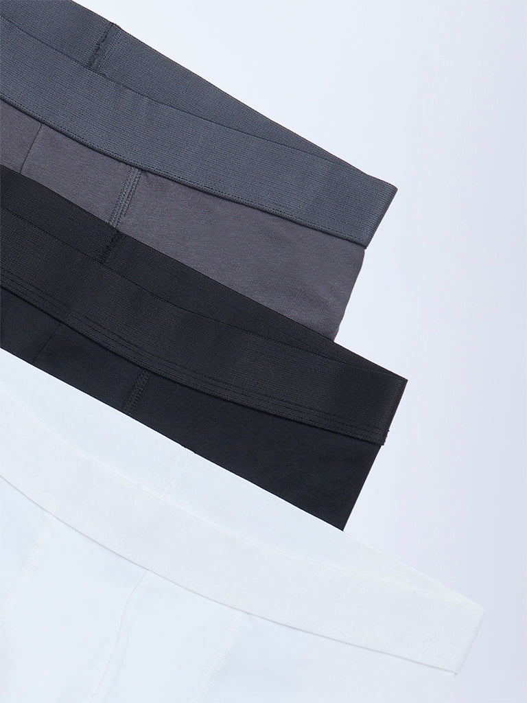 WES Lounge presents this set of three trunks made with pure cotton fabric. Featuring variants of black, white and grey, this elasticated waist mid-rise waist offers supreme comfort with its stretchable base throughout the day.
