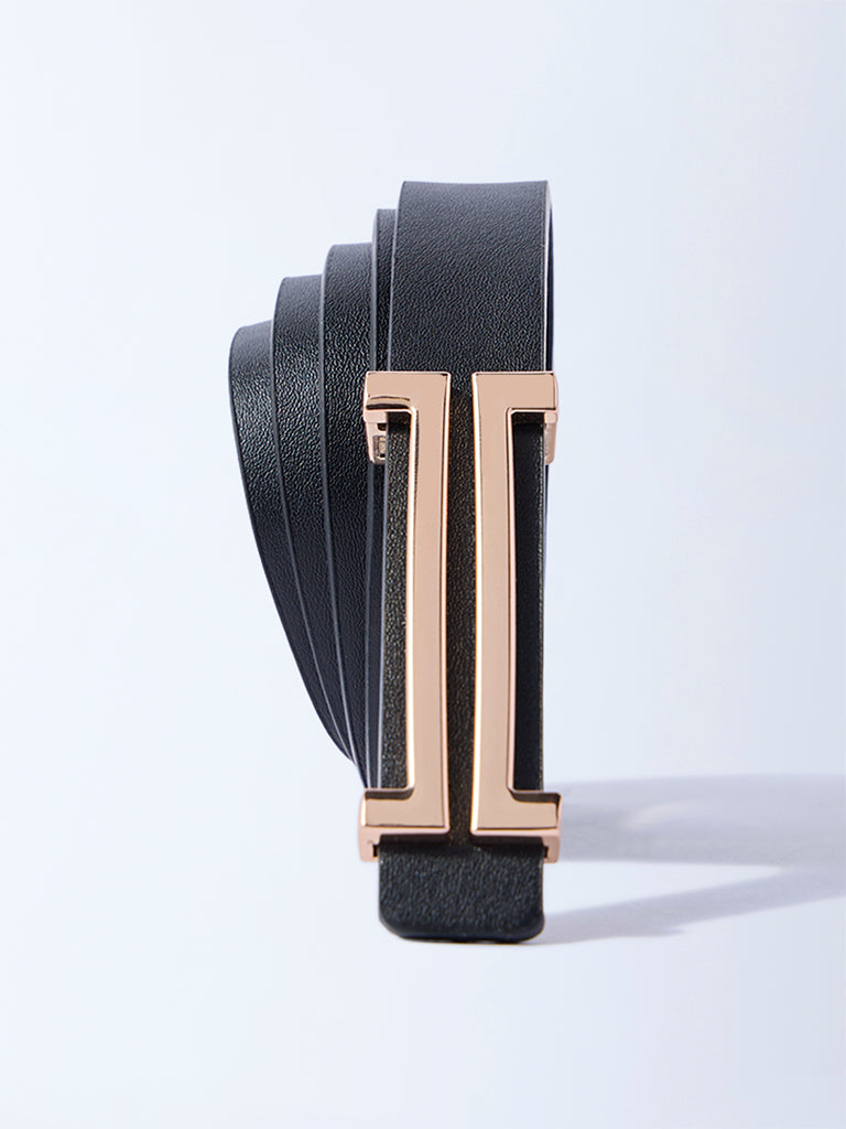 Westside Accessories introduces this black belt that blends function with a hint of flair. Designed with a smooth finish and a slim profile, it slips easily into any look. The standout gold-toned H-shaped buckle adds a edge to the design, while keeping the fit secure. Whether paired with jeans, trousers or dresses, this belt brings a touch of effortless style to your everyday outfits.