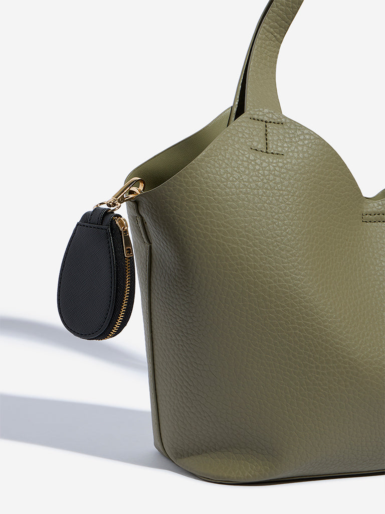 Westside Accessories brings a sleek update to your everyday carry with this black mini wallet bag charm. Designed in a compact, pouch-style silhouette, it opens with a zip-around closure to reveal just enough space for your tiniest essentials. Complete with a polished gold-toned ring and lobster clasp, it’s a chic little add-on that clips effortlessly onto your bag for a touch of style and convenience.