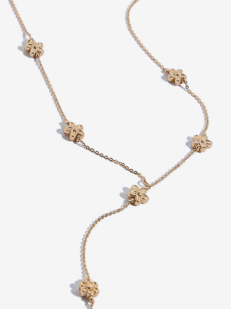 Westside Accessories presents this enchanting gold Y-chain necklace, where delicate floral motifs bloom along a cascading silhouette. Sparkling gemstones highlight each intricate detail, adding a touch of brilliance. Designed for effortless elegance, this piece seamlessly transitions from everyday charm to evening glamour.