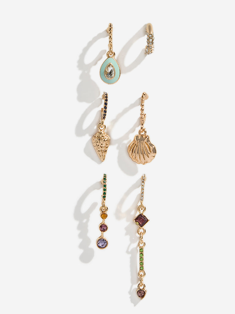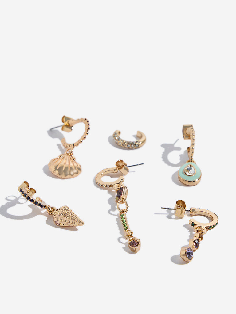 Elevate your jewellery collection with this exquisite gold-toned sterling silver earring stack set from Westside Accessories. Designed for effortless layering, the set includes a delicate seashell drop earring, a shimmering ear cuff, a pearl-accented drop earring, and three uniquely shaped hoop earrings adorned with sparkling stones. Whether worn as a full stack for a bold statement or individually for subtle elegance, these versatile pieces complement everything from casual ensembles to evening attire.