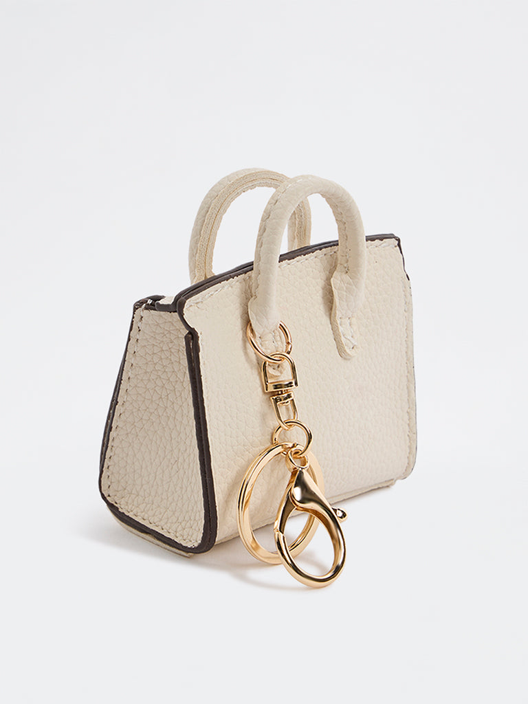 Soft neutrals meet modern detail in this ivory tote-inspired bag charm from Westside Accessories. Designed in a pebbled textured finish, the compact silhouette showcases structured sides, contrast edging and a polished gold-tone button accent. Complete with firm top handles, it attaches effortlessly to everyday bags, adding understated elegance to your carry.