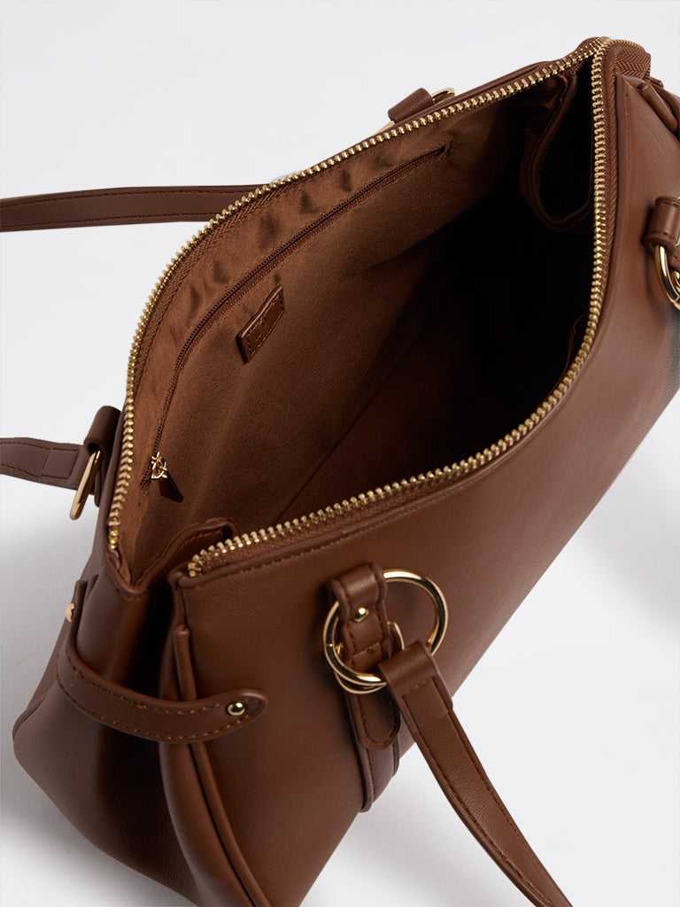 Refresh your styling palette with this brown classic shoulder bag from Westside, designed to bring warmth and depth to everyday looks. Rendered in a rich faux leather finish, the softly structured form is complemented by subtle seam detailing and muted gold hardware that lends a timeless character. The elongated silhouette sits comfortably on the shoulder, opening to a generously sized interior that accommodates daily essentials with ease.