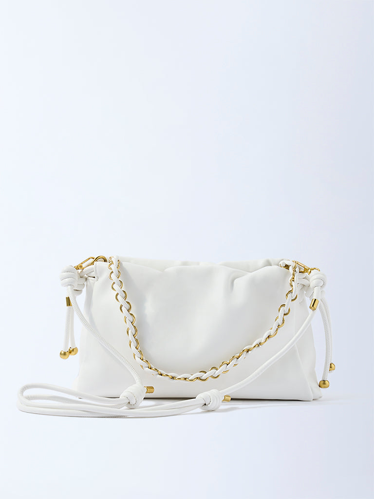 Chic and contemporary, this white sling bag from Westside makes a stylish statement for any occasion. Made from smooth faux leather, it features a gathered silhouette enhanced with a gold-toned chain strap and knotted drawstring sides. The detachable sling handle adds versatility, perfect for both daytime polish and evening elegance.