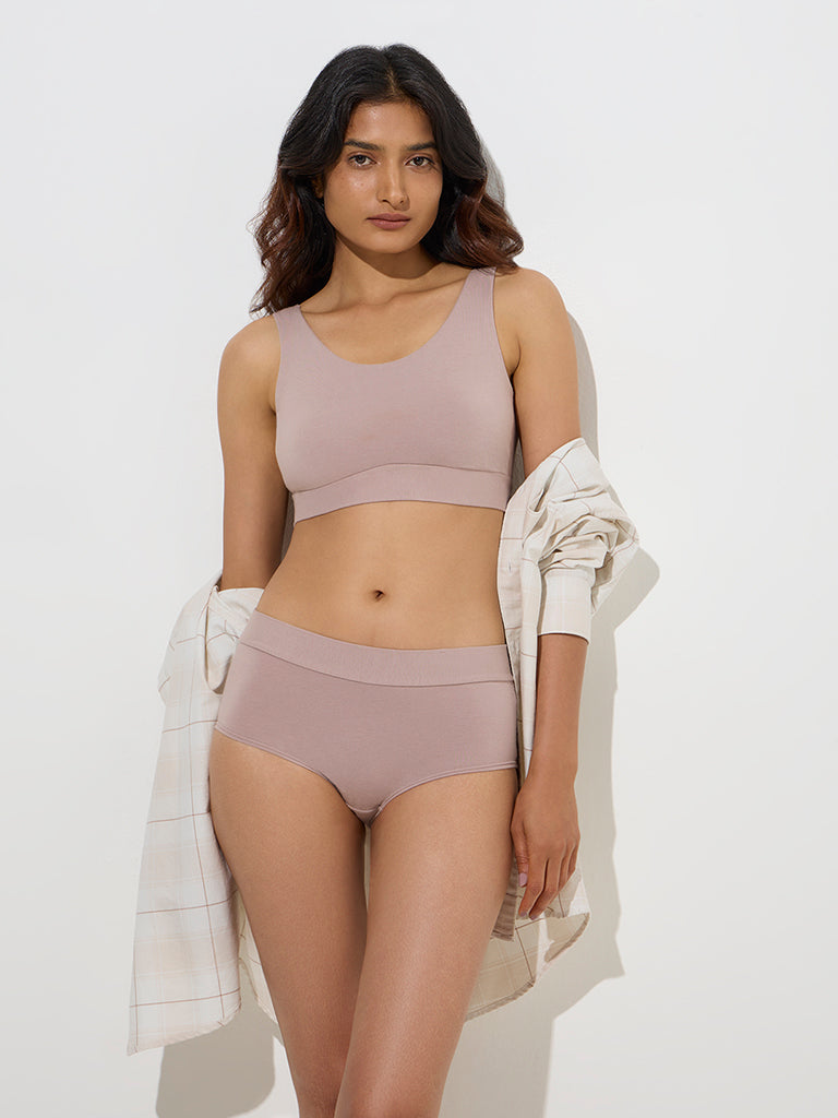 This beige sports bra from Wunderlove is constructed from a soft cotton-blend fabric, offering all-day comfort. Featuring a scoop neck and wide straps, it provides gentle support and a secure fit.