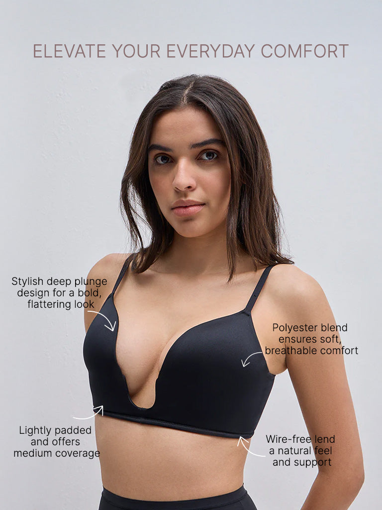 Achieve a stunning silhouette with Wunderlove's black bra, featuring a flattering U-shaped plunge. It is designed with a padded build for enhanced comfort and support. Crafted from soft, breathable fabric, it includes adjustable shoulder straps and a secure back closure.