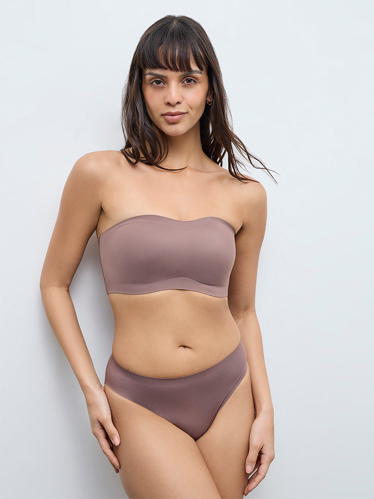A clean solution for strapless dressing, this brown bra from Wunderlove stays secure while remaining unseen. Crafted from a premium-blend fabric that feels smooth on the skin while offering dependable hold. The strapless supergrip construction ensures stability and confidence through movement. Light padding provides subtle shaping without adding bulk. A secure back hook closure allows a snug, reliable fit.