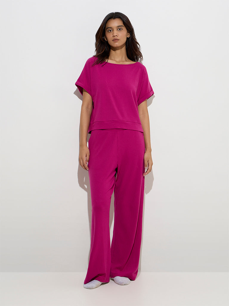 Milled from a lightweight fabric with a ribbed design, this fuchsia t-shirt from Wunderlove offers both style and comfort. Featuring a round neck and upturned dolman sleeves, it’s the perfect pick for relaxed loungewear.