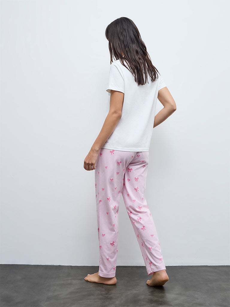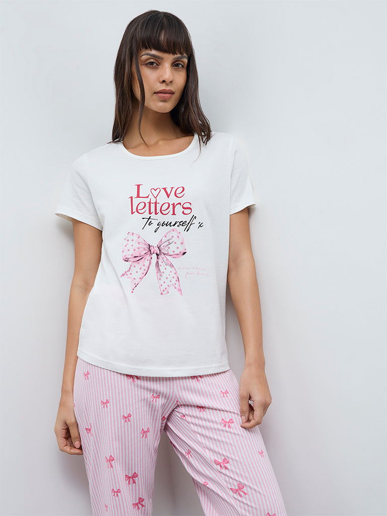 Wunderlove presents this white loungewear set, woven from a pure cotton fabric for superior comfort. The t-shirt features stylised text prints and a bow motif while being styled with a round neck and short sleeves for an easy silhouette. Paired with high-rise pyjamas exhibiting stripe patterns and bow prints, it is fitted with a smooth elastic waistband and adjustable pockets for a secure fit. This set comes neatly packed in a pouch bag for an easy storage option.