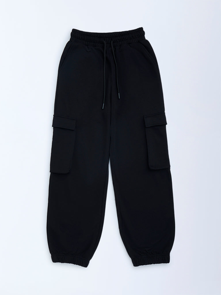 Y&F Kids introduces these black cotton joggers, crafted in a mid-rise fit for everyday ease. The elasticated waistband with drawstring ensures a snug yet flexible fit, while multiple pockets add functionality. A versatile staple that pairs effortlessly with casual tees and hoodies.
