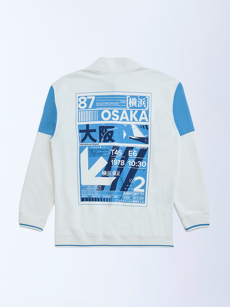This white sweatshirt from Y&F Kids is defined with Japanese text detailing at the front and bold prints at the back. Woven from a soft cotton-blend fabric, it is designed with a high neck, short zipper placket, and full sleeves for cozy comfort.