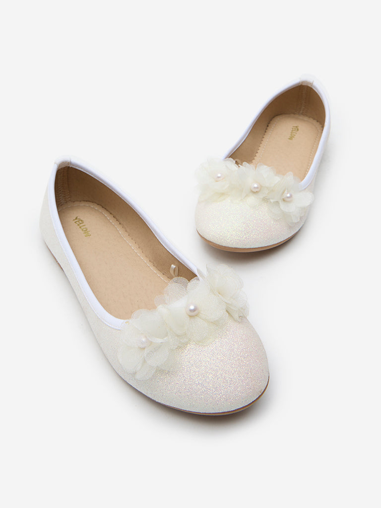 Elevate your style with the Yellow's white shimmer textured ballerina. The footwear offers a round-toe silhouette adorned with exquisite pearl-topped floral detailing on the vamp. . Designed for comfort, they boast a soft insole and a textured outsole for excellent grip.