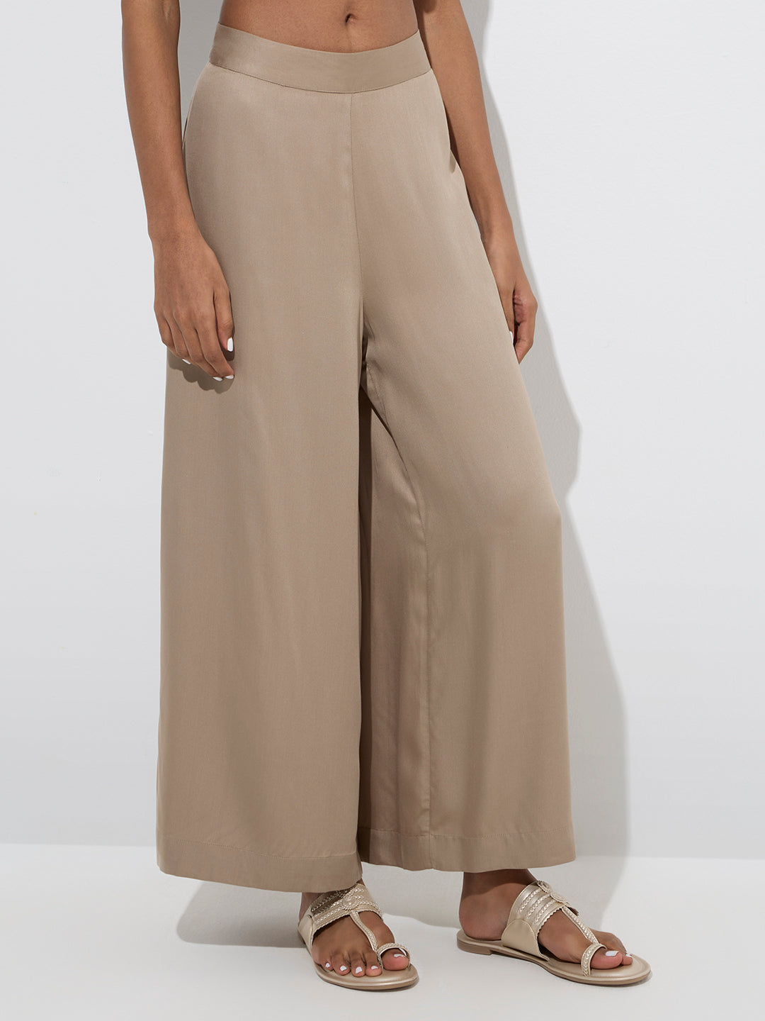 These beige palazzos from Zuba are tailored from a premium fabric, offering a fluid drape and everyday ease. Designed with an elasticated waistband and functional side pockets, they combine comfort with considered detailing.