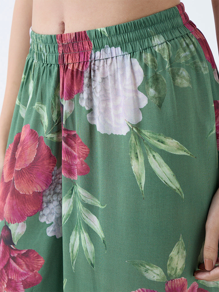 Complete your ethnic ensembles with these dark green floral palazzos from Zuba. Milled from a lightweight fabric for ease of movement, they are designed with an elasticated waistband and adjustable drawstrings for a secure yet comfortable fit.