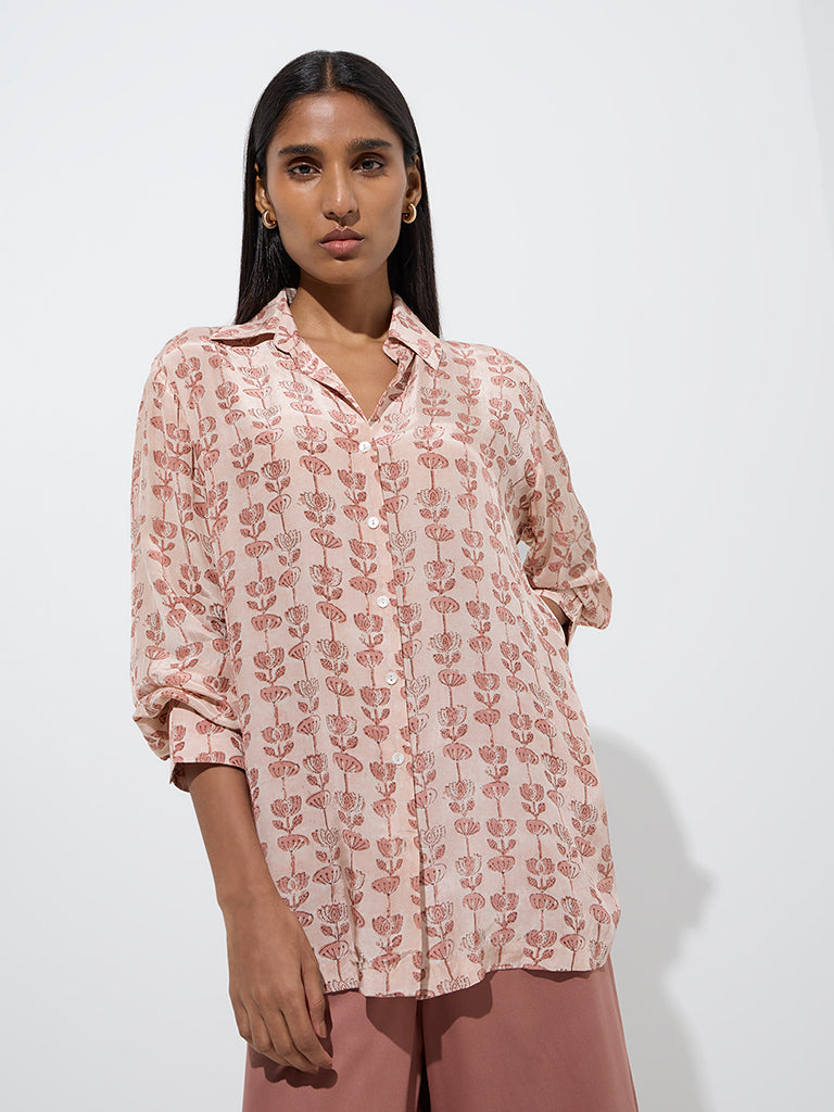 Bathed in soft peach hues, this ethnic tunic from Zuba is detailed with floral motifs that evoke gentle elegance. Made from a lightweight fabric, it features a shirt collar, a button placket, and full sleeves with buttoned cuffs.